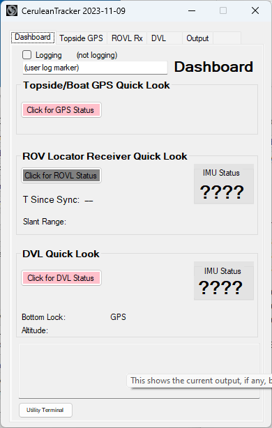 Normally, you should have all the hardware devices connected and powered before launching CeruleanTracker. When CeruleanTracker is launched, it shows the tabbed main window (see Figure below). CeruleanTracker remembers the previous configuration of ports and parameters and open windows and restores all of these on launch. Initially (first launch), it will immediately start searching for a DVL on Ethernet, an ROVL Receiver on serial, and a topside GPS on serial. Using the radio buttons on the device tabs you can select different options, such as forcing the PC to look on specific serial ports for specific devices, and/or selecting serial input for the DVL, and/or turning off the search for devices that are not present.