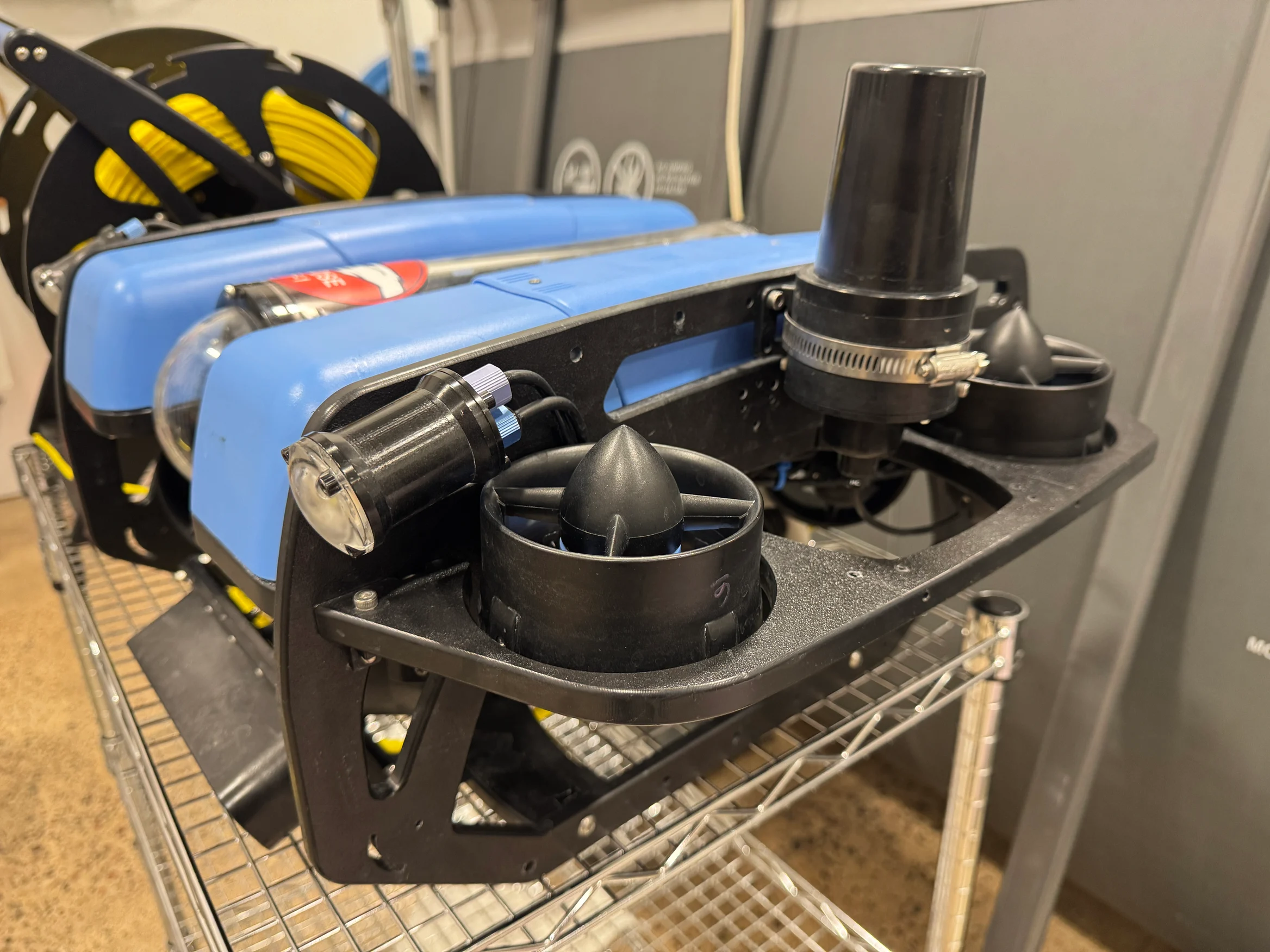 2. Install the transponder using the provided mount and hose clamp onto the ROV Frame. Below is an example mounting location as used during testing.\ <br>
