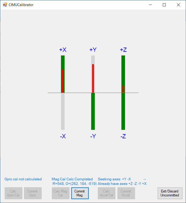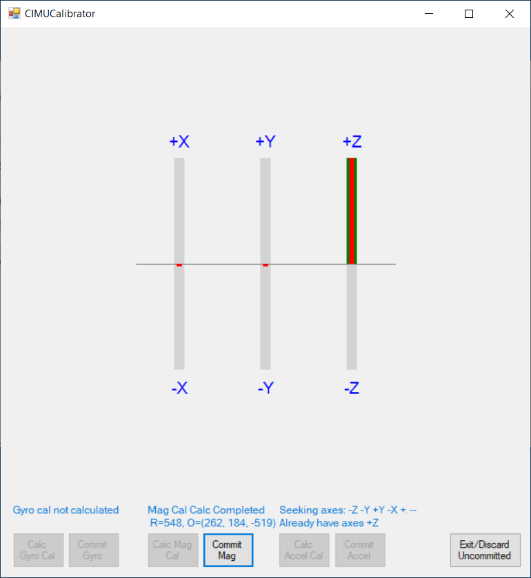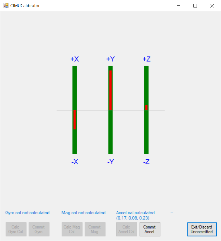 When all six axis directions are collected, you will have the opportunity to commit them to the device. If you like what you have collected, you can click the "Commit Accel" button and the parameters will be sent to the device to overwrite the previous parameters. If you're finished, click the "Exit" button.&#x20;