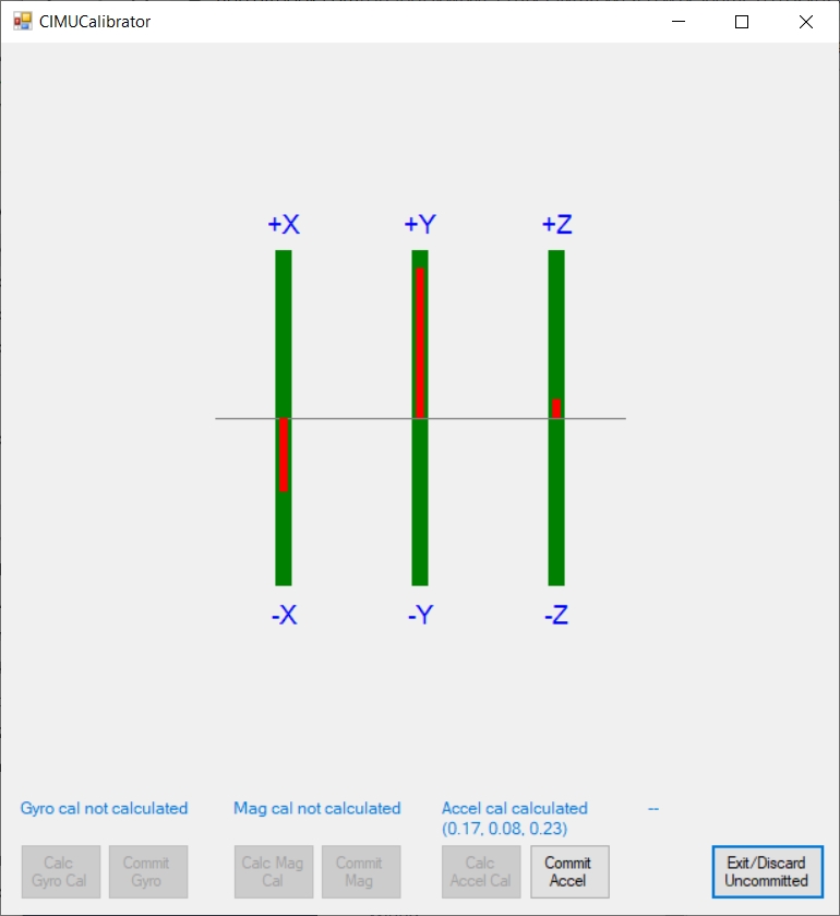 When all six axis directions are collected, you will have the opportunity to commit them to the device. If you like what you have collected, you can click the "Commit Accel" button and the parameters will be sent to the device to overwrite the previous parameters. If you're finished, click the "Exit" button.