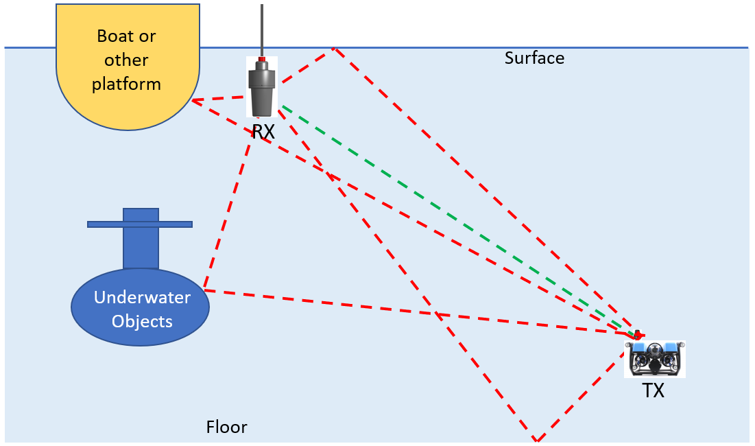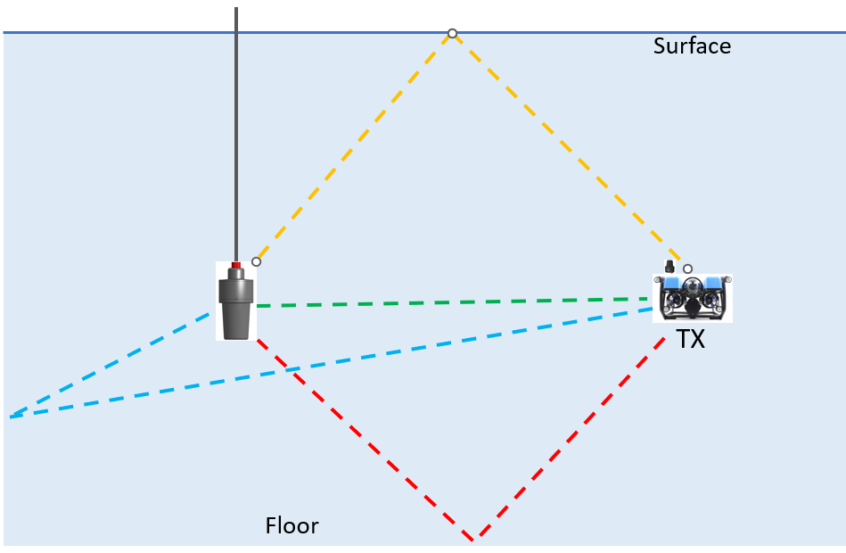 <figure><img src="https://content.gitbook.com/content/lN2lfY7yE0hWlcn6W1BS/blobs/bKLJh3As9hinf8PirH2J/image.png" alt=""><figcaption><p>Ideal ROVL operating conditions are when all reflected paths (red, orange, blue) are longer than the the direct signal path (green) by at least the length of the signal "ping". This example ignores any reflections created by the ROV itself.</p></figcaption></figure>