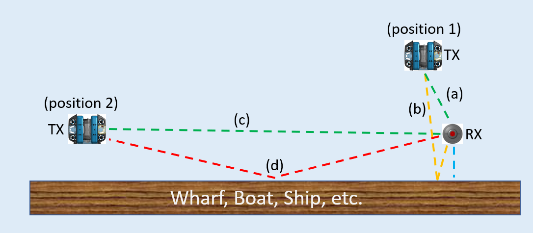 <figure><img src="https://content.gitbook.com/content/lN2lfY7yE0hWlcn6W1BS/blobs/suOR9ZswcurfwMJ7ptEo/image.png" alt=""><figcaption><p>The receiver can be a just over a half-ping length away from a reflector (blue line). When the ROV is in position 1, the yellow reflected path (b) is more than a ping length longer than the direct green path (a).  When the ROV is in position 2, the red reflected path (d) may be substantially less than one ping length longer than the green direct path (c), in which case there is a potential for interference. Also try to think about the same issue in all dimensions (i.e., transmitter and receiver operating next to a flat, reflective sea floor).</p></figcaption></figure>