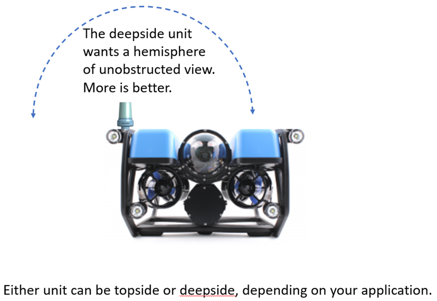 "P" package Mk II transmitter or Mk III transceiver mounted on an ROV. Cerulean Sonar supplies a mounting block and a hose clamp for mounting a deepside unit to an ROV.