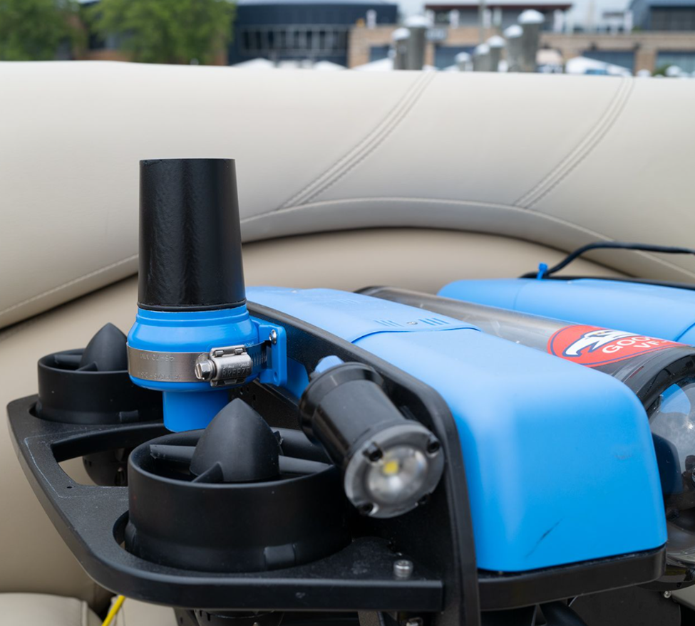 ROVLe Mk V Transmitter / Transponder mounted on a BlueROV2 Heavy ROV using the suppled mounting bracket