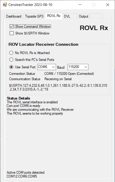 <figure><img src="https://content.gitbook.com/content/lN2lfY7yE0hWlcn6W1BS/blobs/32Hc4FdmmeRlg7Stpu0o/image.png" alt="" width="244"><figcaption><p>ROVL Rx Tab on CeruleanTracker Main Window, showing a normal status.</p></figcaption></figure>