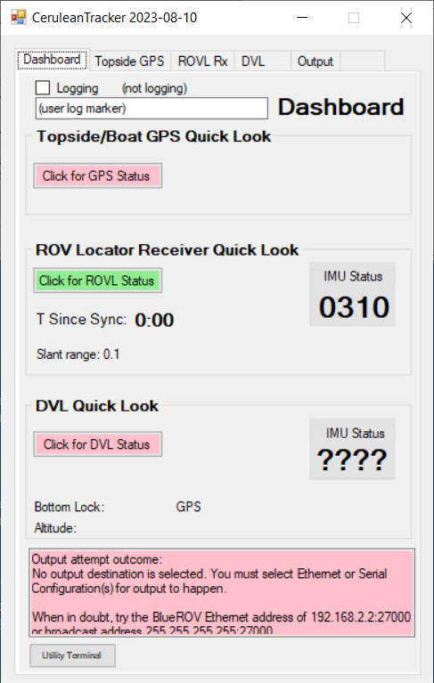 <figure><img src="https://content.gitbook.com/content/lN2lfY7yE0hWlcn6W1BS/blobs/FXcCncMY5ARbNZznCZJM/image.png" alt="" width="244"><figcaption><p>Dashboard Tab on CeruleanTracker Main Window, showing a normal status for the ROVL</p></figcaption></figure>