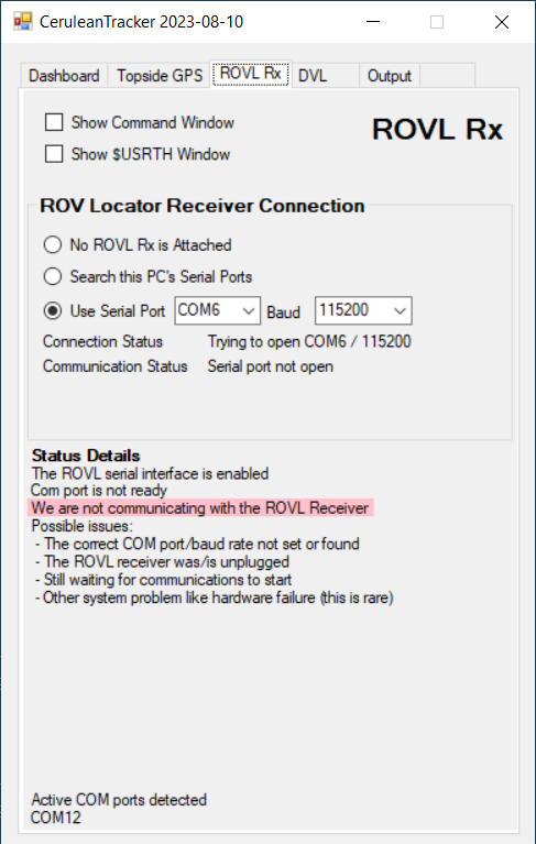 Here is an example of an unstructured quick troubleshooting session. A quick first thing to to is look at the ROVL Rx tab on the CeruleanTracker main window (example below). The example shows the user is trying to select COM port 6 to talk to the ROVL receiver (or transceiver). Looking at the bottom of the window, it appears that CeruleanTracker is not detecting COM port 6. Looking at the status details, there are some issues listed that might cause the error.&#x20;