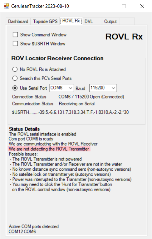 Now, CeruleanTracker has detected the ROVL Receiver on COM port 6 (the port number is assigned by Windows and may be a different number on your computer). Now we are talking to the receiver but it is not communicating with the transmitter/transponder. Some possible reasons are given in the status details area.