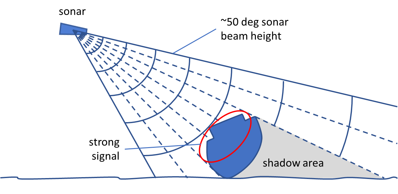 This is to illustrate the benefit of scanning from above a target. The basic idea is to get up above the bottom and angle the sonar downward slightly. The benefit is that objects projecting above the bottom cast an "acoustic shadow" behind them which tends to highlight them on the sonar image and gives an indication of their height.&#x20;