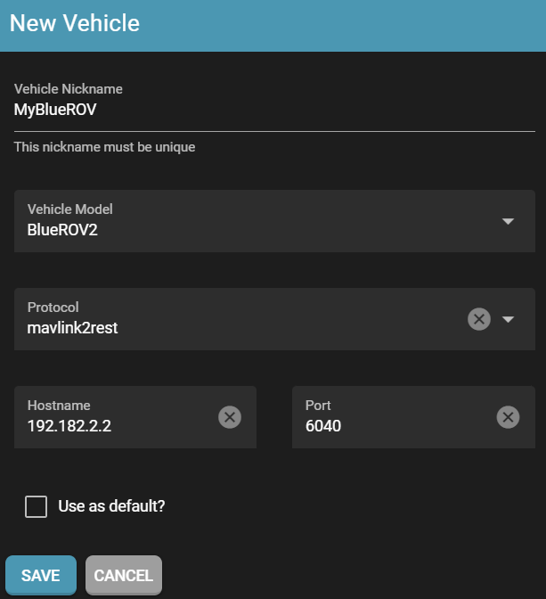 The vehicle model is just aesthetic. The necessary fields are the nickname, protocol (only mavlink2rest is support atm), hostname and port